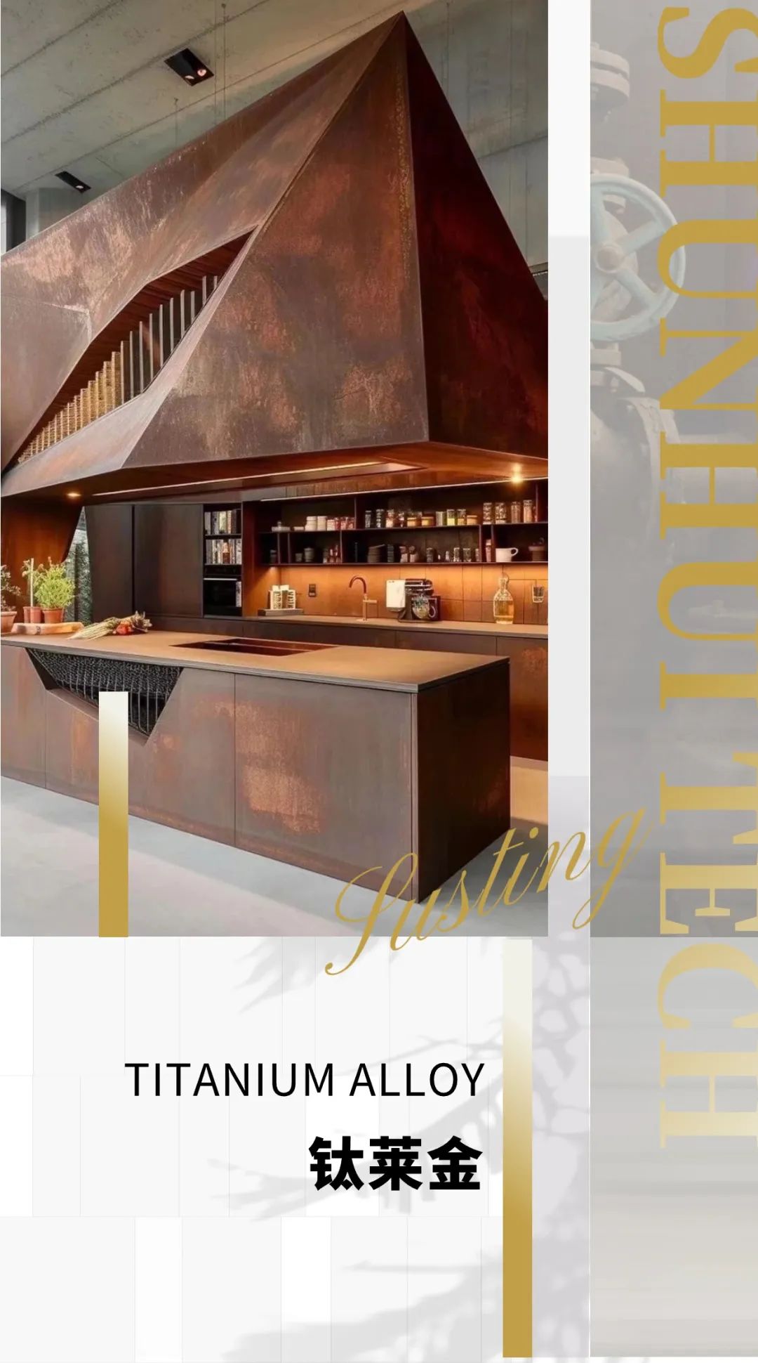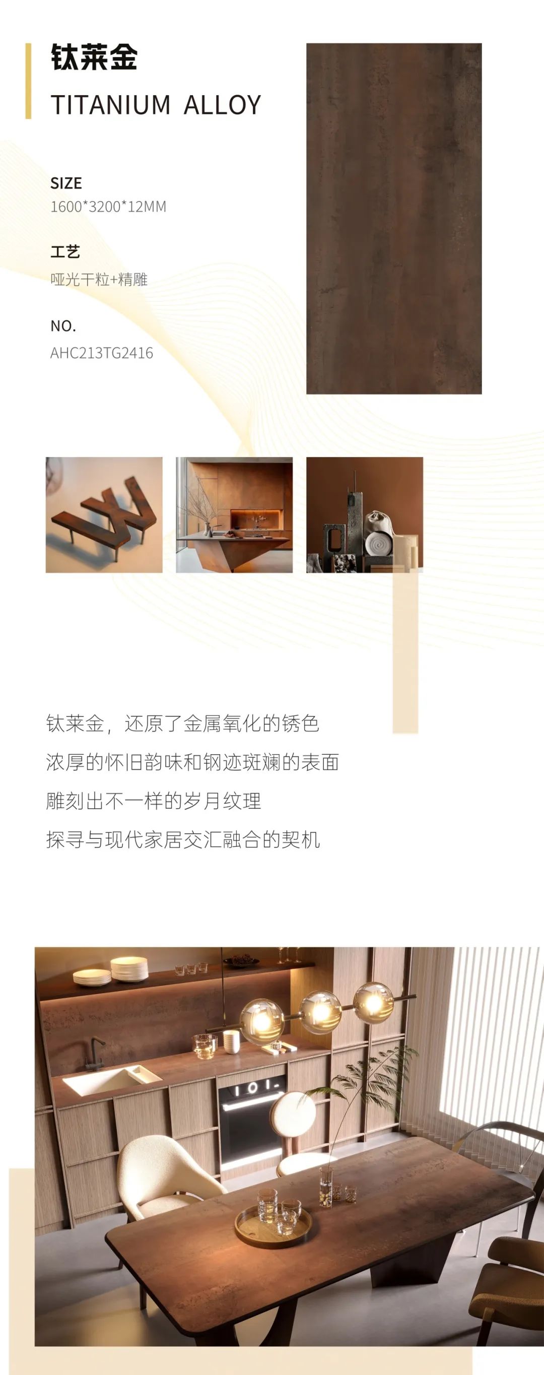铁锈,表达怀旧美学的介质 聚焦闪耀光泽与温暖色调 在众多家居中脱颖而出且自成一派 顺辉天成岩板从复古感极强的 生锈金属的斑驳表面中汲取灵感 通过先进工艺将金属釉料布于坯体 在岩板上呈现流光溢彩的铁锈质感