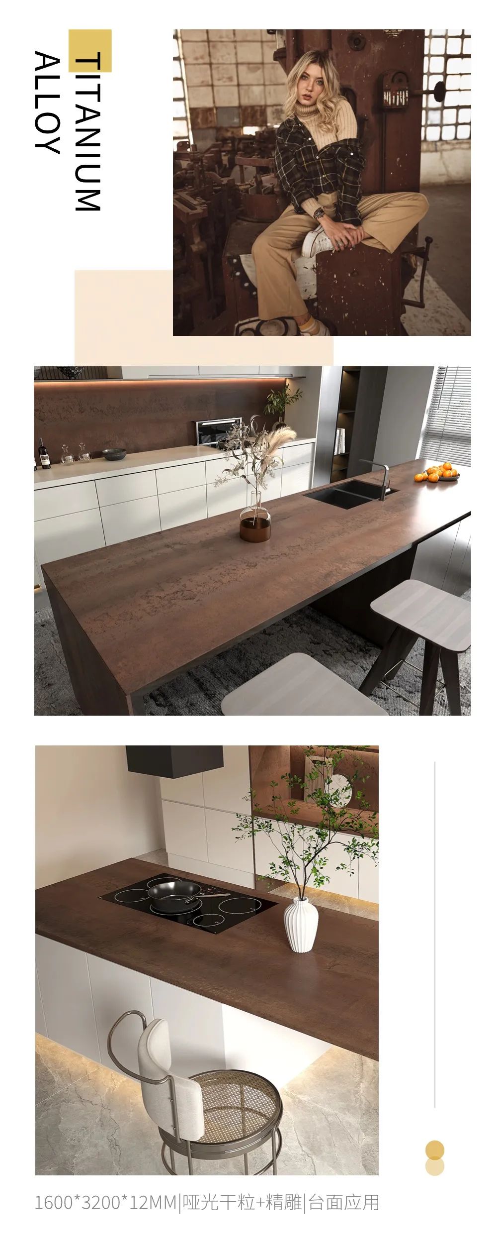 甄选国际顶尖进口釉料,通过哑光干粒+精雕技术,还原金属生锈氧化后的斑驳表面,像历经岁月沉淀后的坚韧精神和力量。微度凹凸的颗粒感,如同时间剥落浮华下的外表,在岩板表面上显露最真实的原貌。