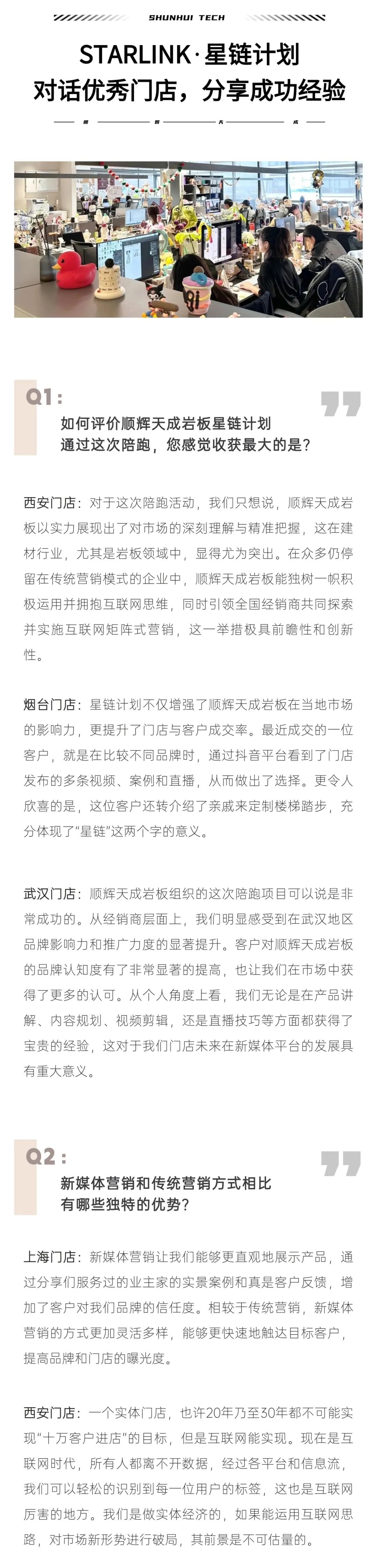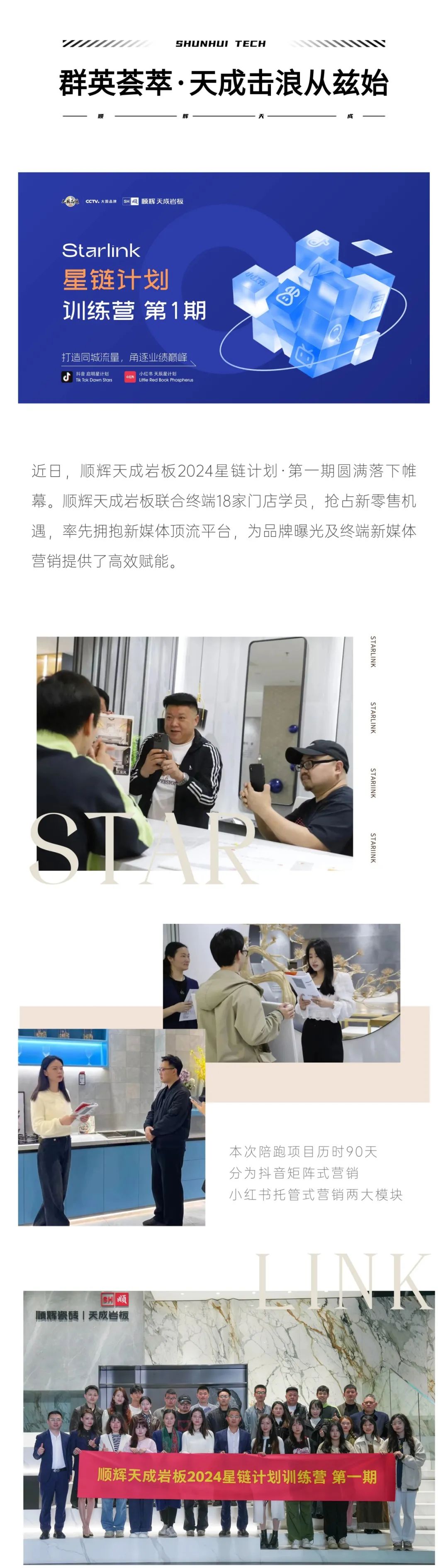 群英荟萃,天成击浪。星链计划第一期活动已圆满结束,且取得了显著的成效。未来,顺辉天成岩板将继续深化星链计划,为终端门店提供全方位的支持与赋能,推动更多创新的营销活动,助力门店在新媒体时代展翅高飞。