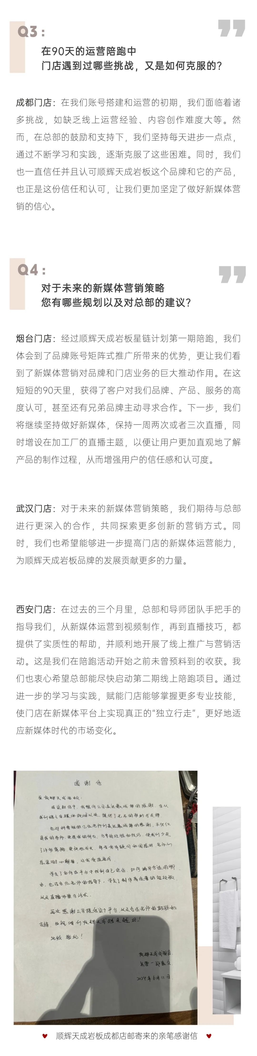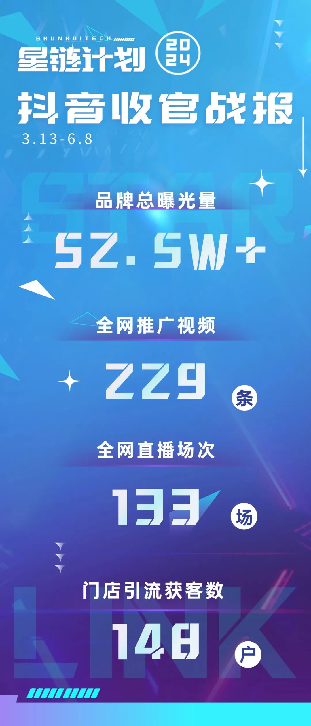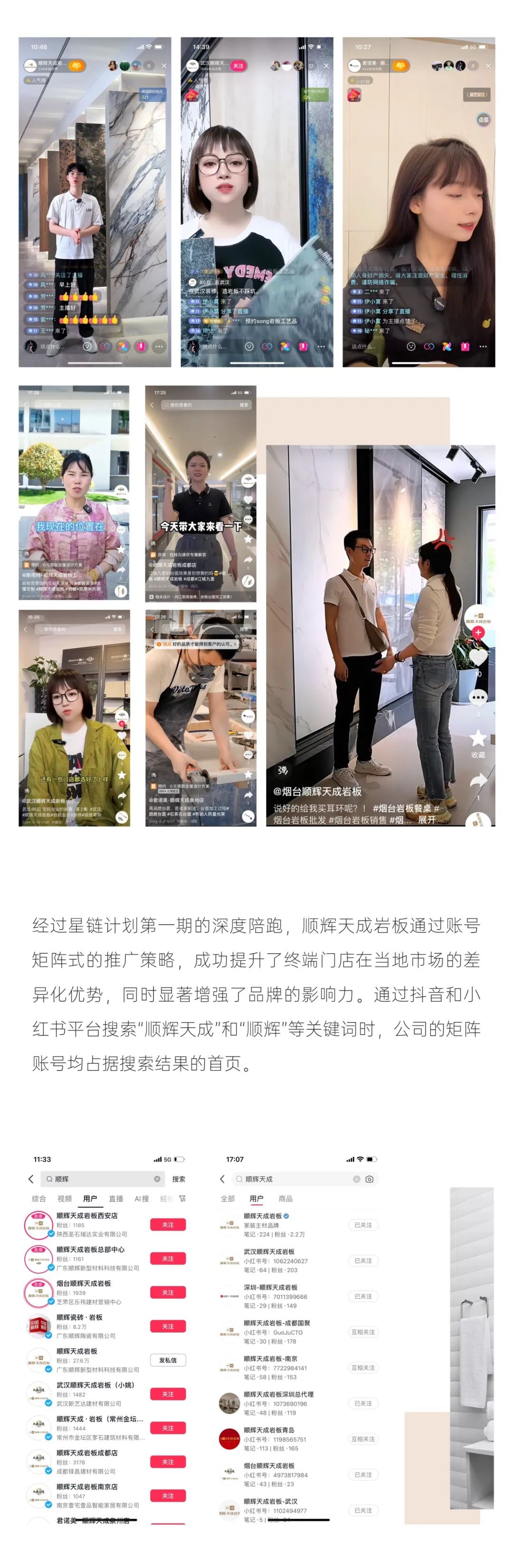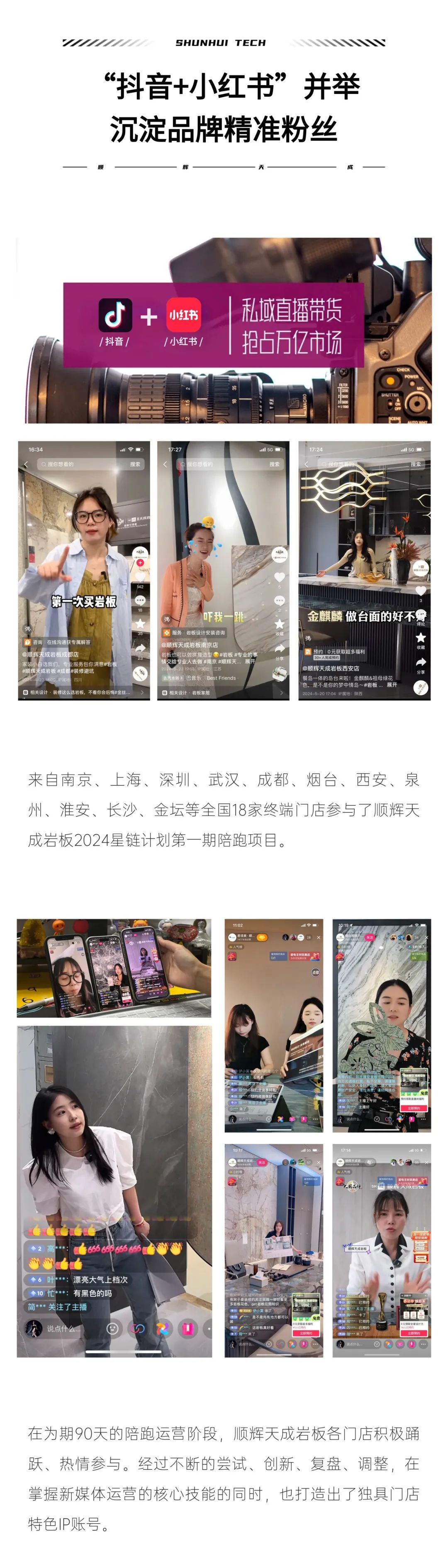 全方位专业赋能、聚焦抖音同城引流及营销,在顺辉天成岩板星链#启明星计划90天的陪跑项目中,终端门店在抖音平台短视频曝光量高达52.5W+,全网推广视频累计229条,直播场次133场,门店总计引流获客数148户,实现门店在抖音平台增长新突破!