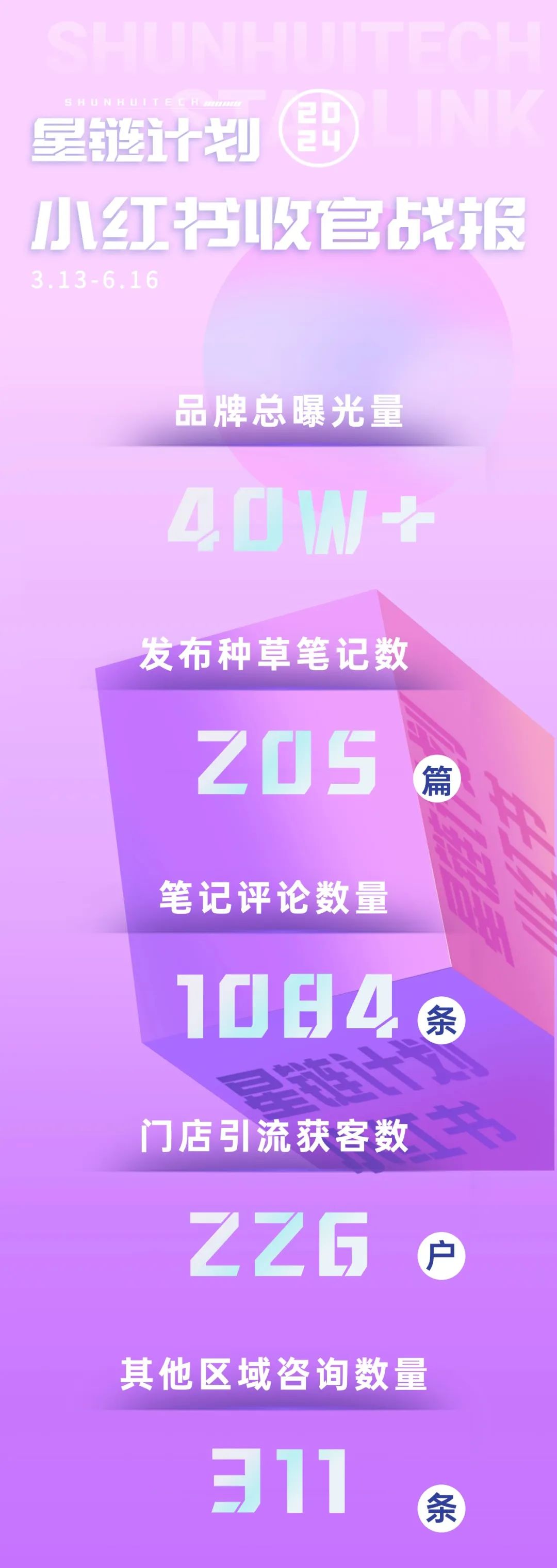 小红书平台吸引着高净值用户,与家居消费者的属性高度契合。因此,拓展小红书内容营销已成为岩板家居商业布局的关键一环。在顺辉天成岩板的星链#天辰星计划指导下,导师们帮助门店从零开始建立小红书账号,并不断更新内容。截至6月15日,顺辉天成岩板门店的小红书账号总曝光40W+,共发布205篇笔记,品牌+门店总计引流获客数537位。