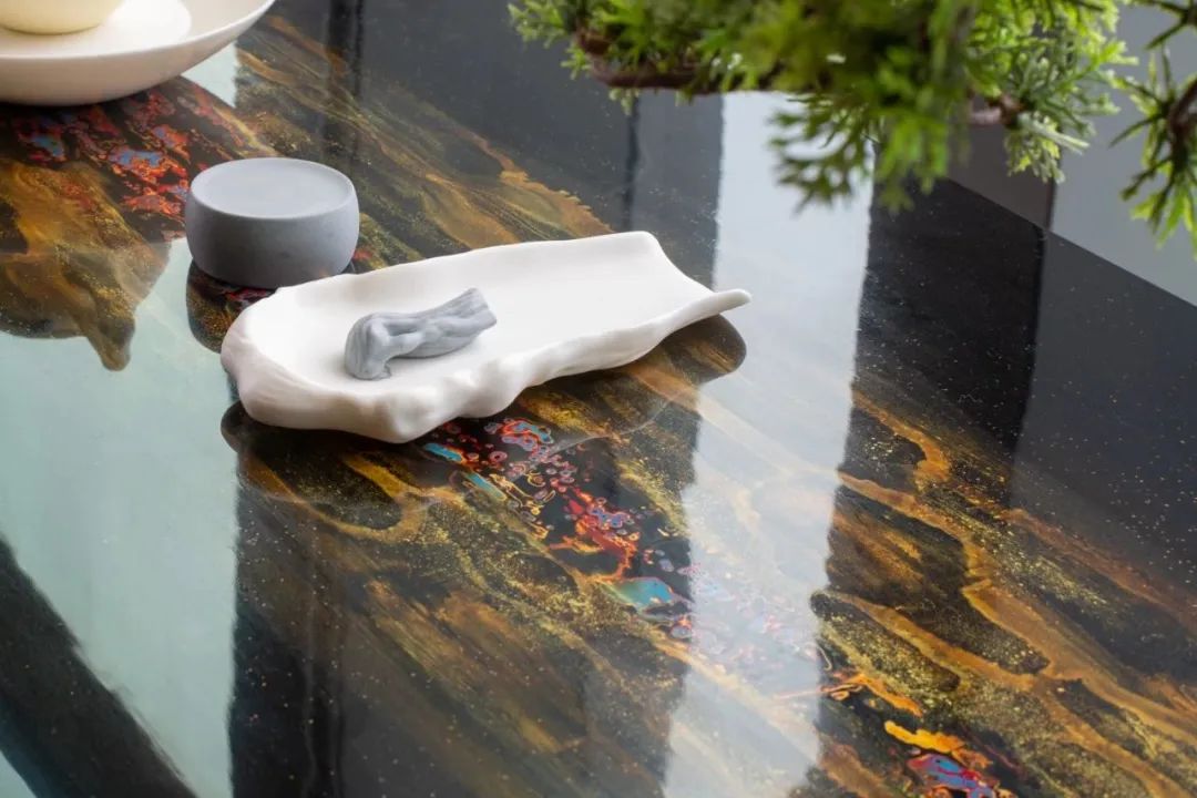 • 炫彩大漆 从漆道器·从技到艺 - 根植东方文化,传古而不泥古 2023年,顺辉天成岩板的设计团队 在经历无数次改稿、迭代、升级后 在经典版和风尚版的基础上 以炫彩釉复烧工艺为基底 融合立体复合材料,研发创出 第三代「炫彩大漆」系列新品 再现一场赓续传统工艺 缔造岩板漆艺家居的新生盛宴 - -