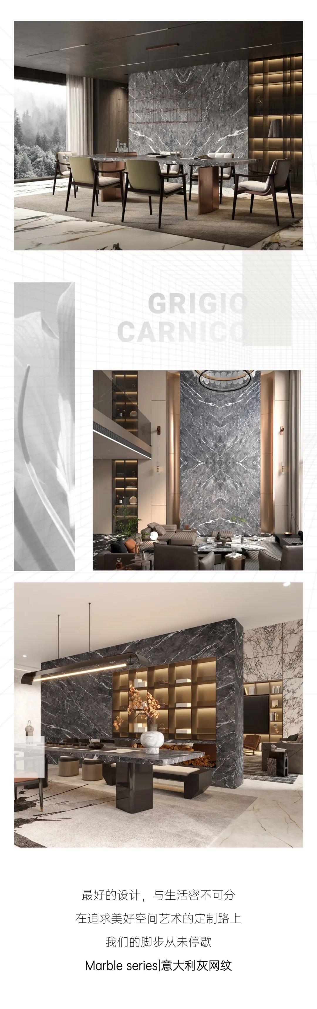 乳白色纹理在浅灰色调肌底内 交织错落,如星空的织网 以恢宏的气势,激扬起生命的最高格调 在不同展示方式上,意大利灰网纹 启发着全新的感知境界,更以其独特之姿 将空间的层次变幻得丰富而深邃