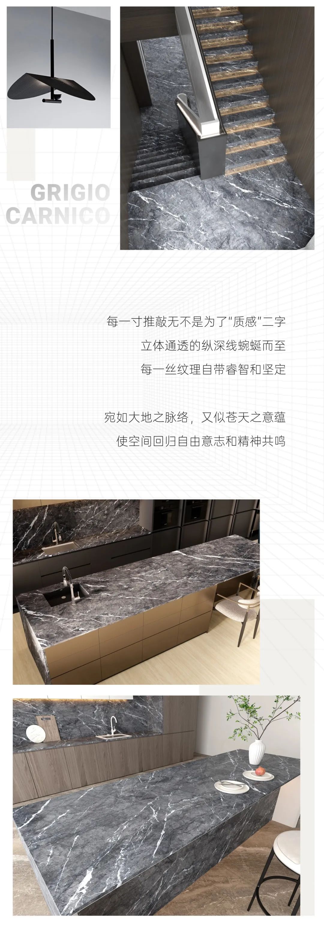 灰——是一个非常广阔的色域,它生存在灵活的灰色空间。灰比黑隐蔽一些,比白忧郁。它内敛、朦胧、低调一些,不像黑色那么硬,不像白那么绝对。灰在审美感知方面富有弹性,它是退一步的海阔天空。 ” 溯 大自然是世界上最出色的设计师 也是我们每一片产品灵感的来源 顺辉天成岩板意大利灰网纹 萃取穿越亿年的珍稀理石纹样 以岩语触发现代人居生活的全新想象 产 品 元 素