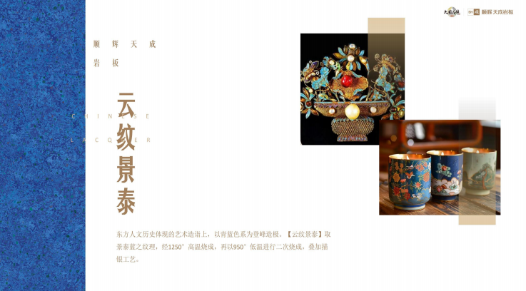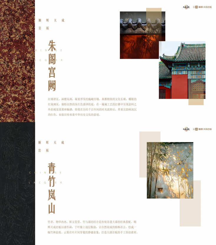 产品差异化、特色化是市场制胜的关键。顺辉天成岩板延续顺成陶瓷集团二十多年“顺”文化底蕴,从品牌到产品,紧密围绕中国传统文化和艺术的传承与创新。2020年,怀着对中国非遗文化的热爱,让文化瑰宝焕发光彩的初衷,顺辉天成岩板以「漆」为题,推出第一代经典大漆系列,旨在让中国非遗漆艺回归当代人居生活。