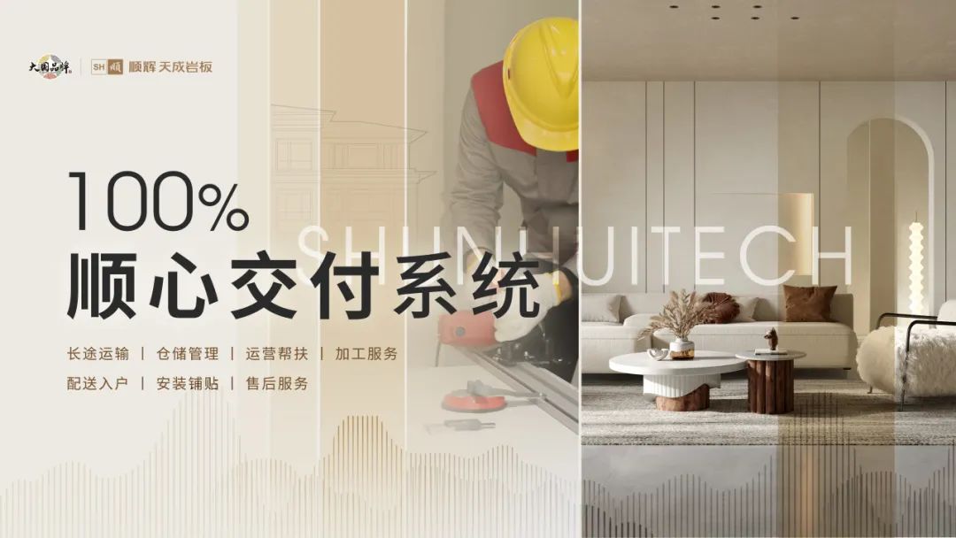 作为引领行业创新发展的岩板品牌,2022年初顺辉天成岩板全面确立了1+N【全屋岩板】的发展战略,以全球化的视野布局,实现了从“先行者”到“引领者”的步伐转变。为了更好的将全屋岩板战略贯彻落地,顺辉天成岩板整合产业链优质资源,推出【100%顺心交付服务系统】,旨在从运输、仓储管理、运营、加工、铺贴安装、售后全方面帮助终端经销商解决岩板经营过程中遇到的各种问题。同时顺辉天成岩板1+N全屋岩板发展战略的确定,更提升了顺辉天成岩板在全屋岩板渠道服务中的核心竞争力。