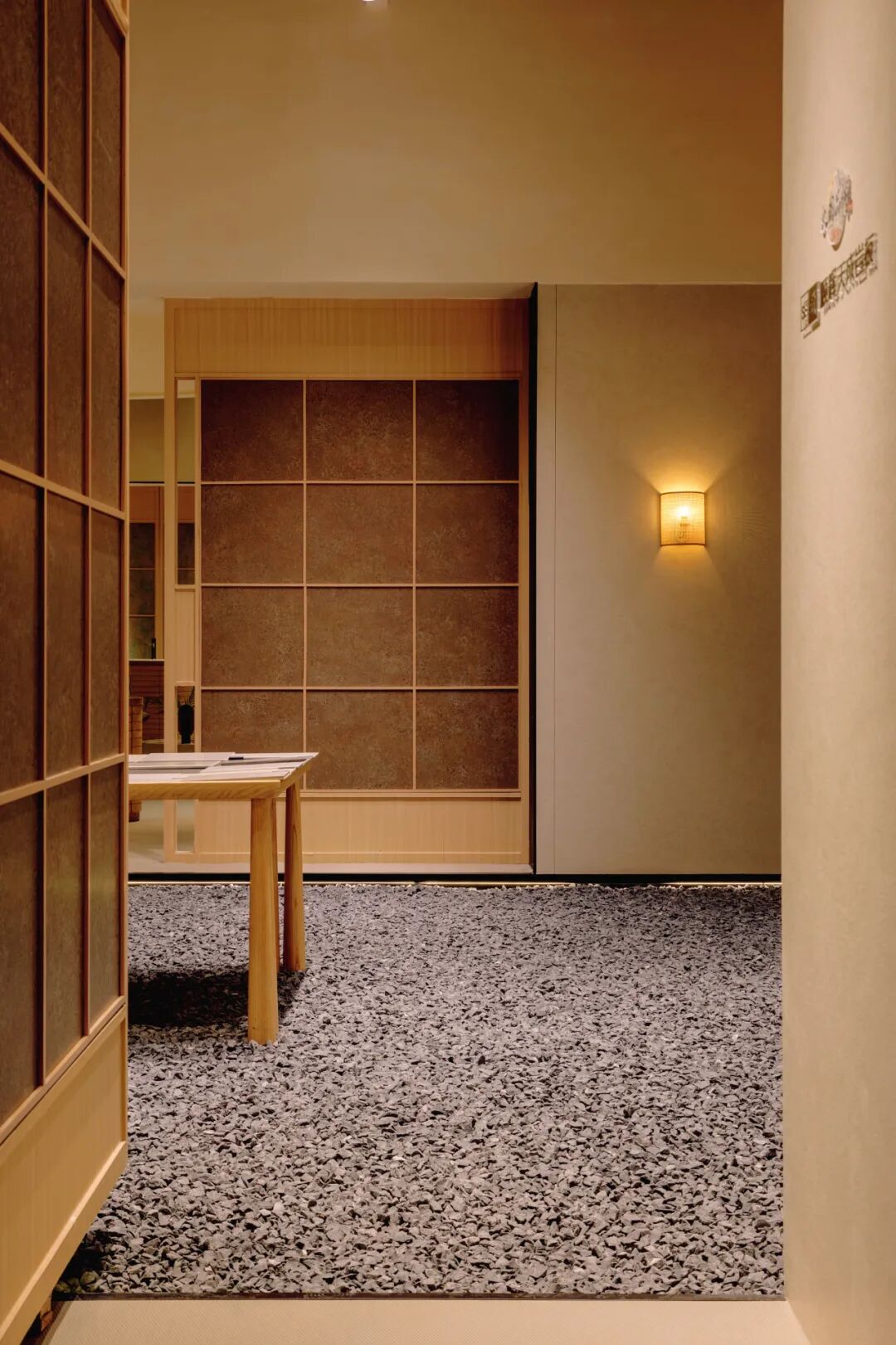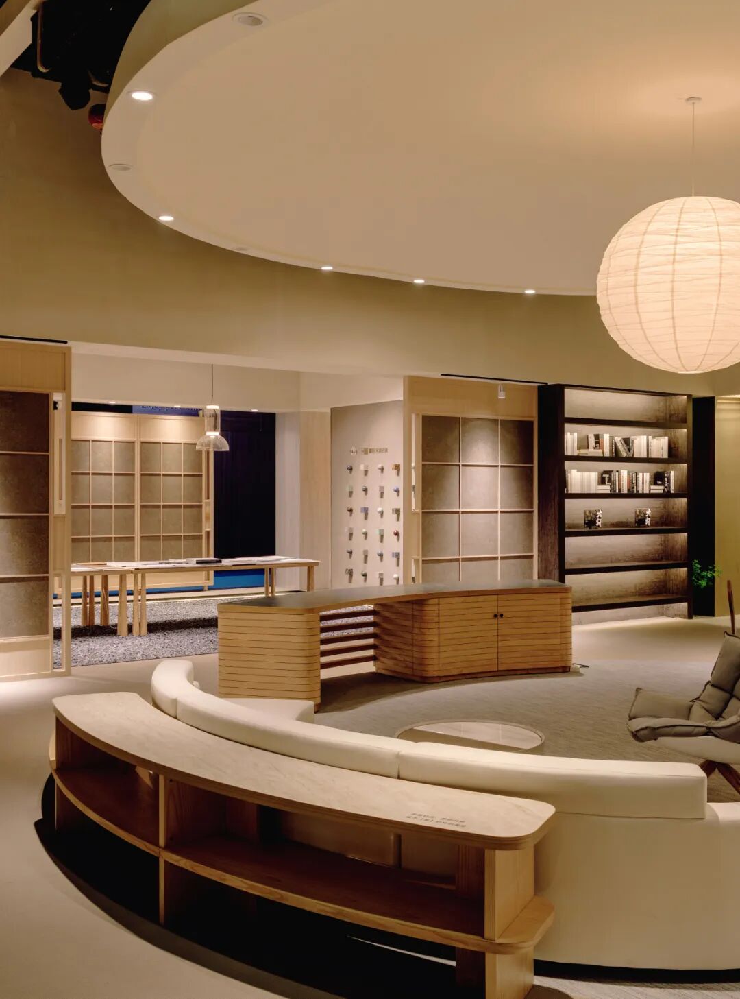 一方半私密茶空间,是归家途中的松弛私域。茶台、酒柜与餐边柜以木作与大漆共生打造,温润的木质感与细腻的漆艺肌理相得益彰,串联起东方空间美学的精髓。茶烟轻飏时,可与亲友慢聊家常;光影斑驳处,能独自轻享闲趣。