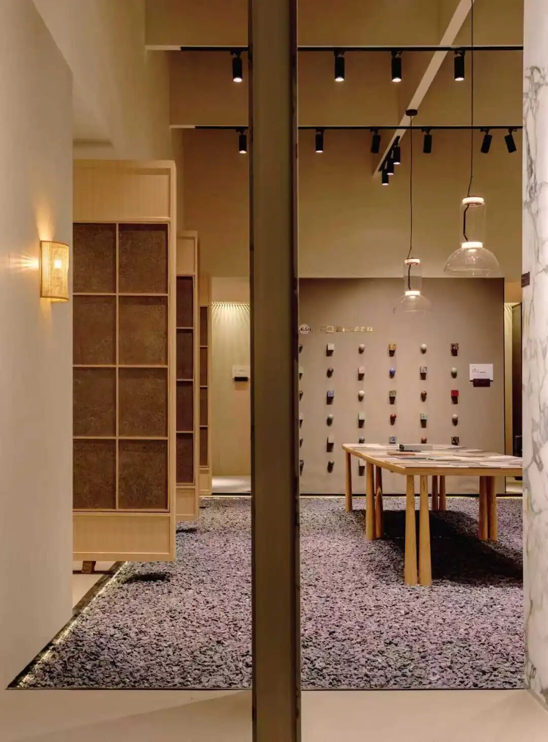 选材区的核心墙面,“大漆十八子”静静陈列,藏着东方美学的深厚密码。十八子之名源自佛教文化中的“十八界”,承载着六根、六尘、六识的哲思,更寄托着吉祥圆满的美好期许。螺钿的璀璨、描金的华贵、莳绘的细腻、戗金的利落、犀皮的肌理、蛋壳镶嵌的质朴、素髹的纯粹、漂漆的灵动…
